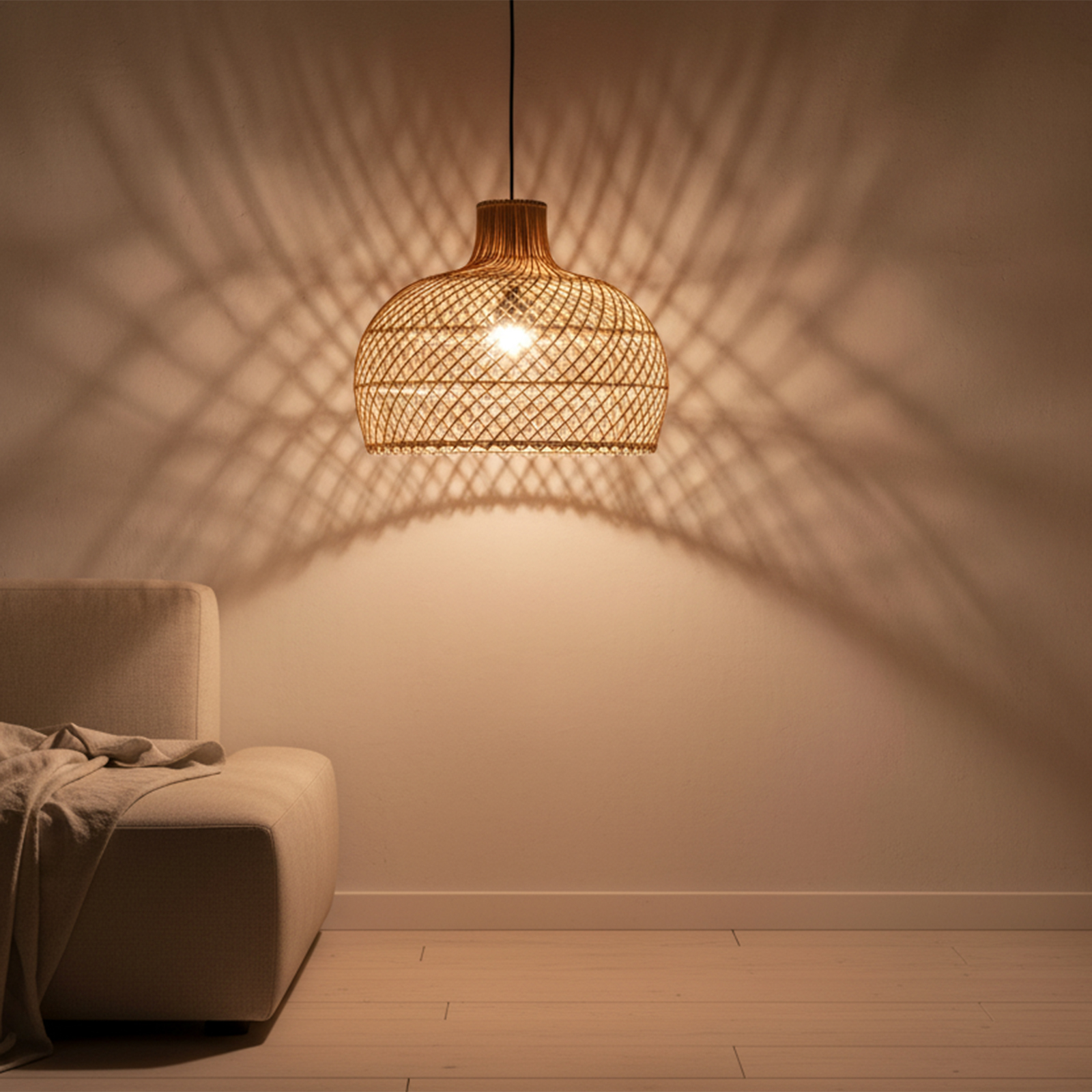 Het zachte licht dat door het vlechtwerk komt, maakt rotan lampen ook geschikt voor slaapkamers. Ze geven een rustige en ontspannen sfeer.