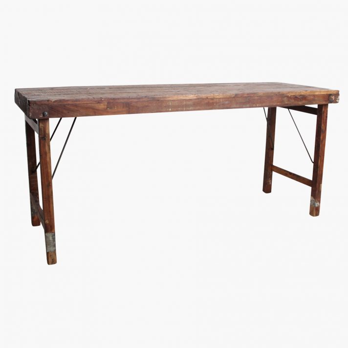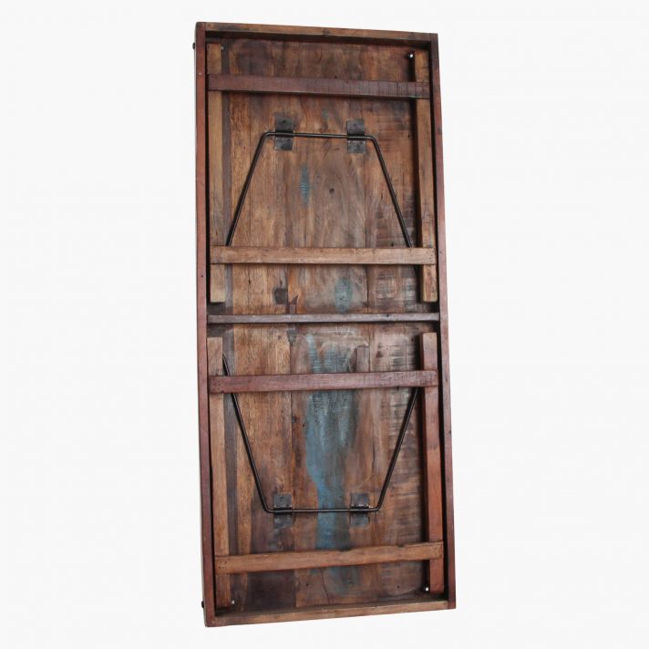 We buy big lots of old and used folding tables from all over India. In our factory in India, we restore the tables ourselves. Old broken planks are replaced with planks from another table. We remove nails and re-finish the top. The table legs are often too far gone. We replace them with a more sturdy iron support and remake legs from recycled wood. If this is not done, then the tables will moving left to right. Our tables are fully restored and checked on all points.