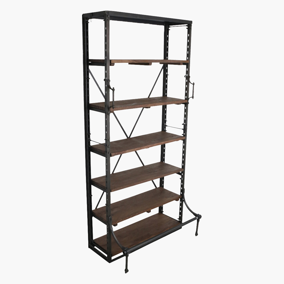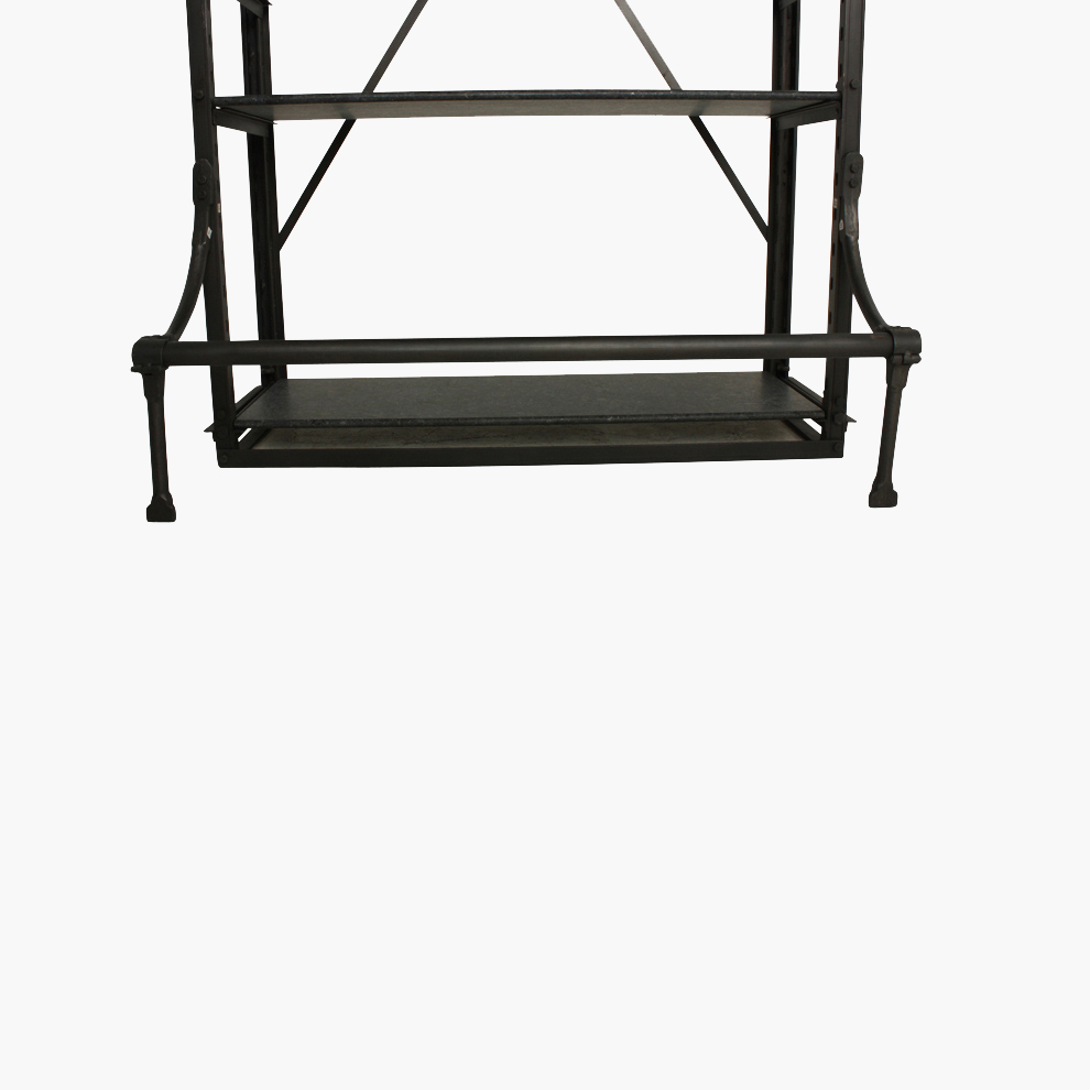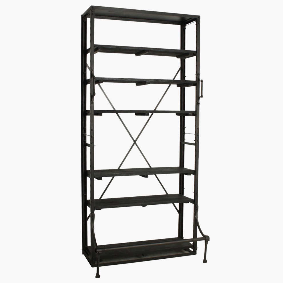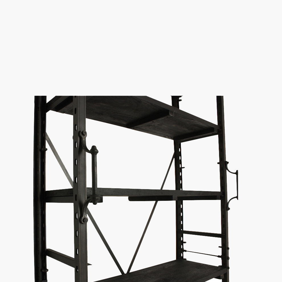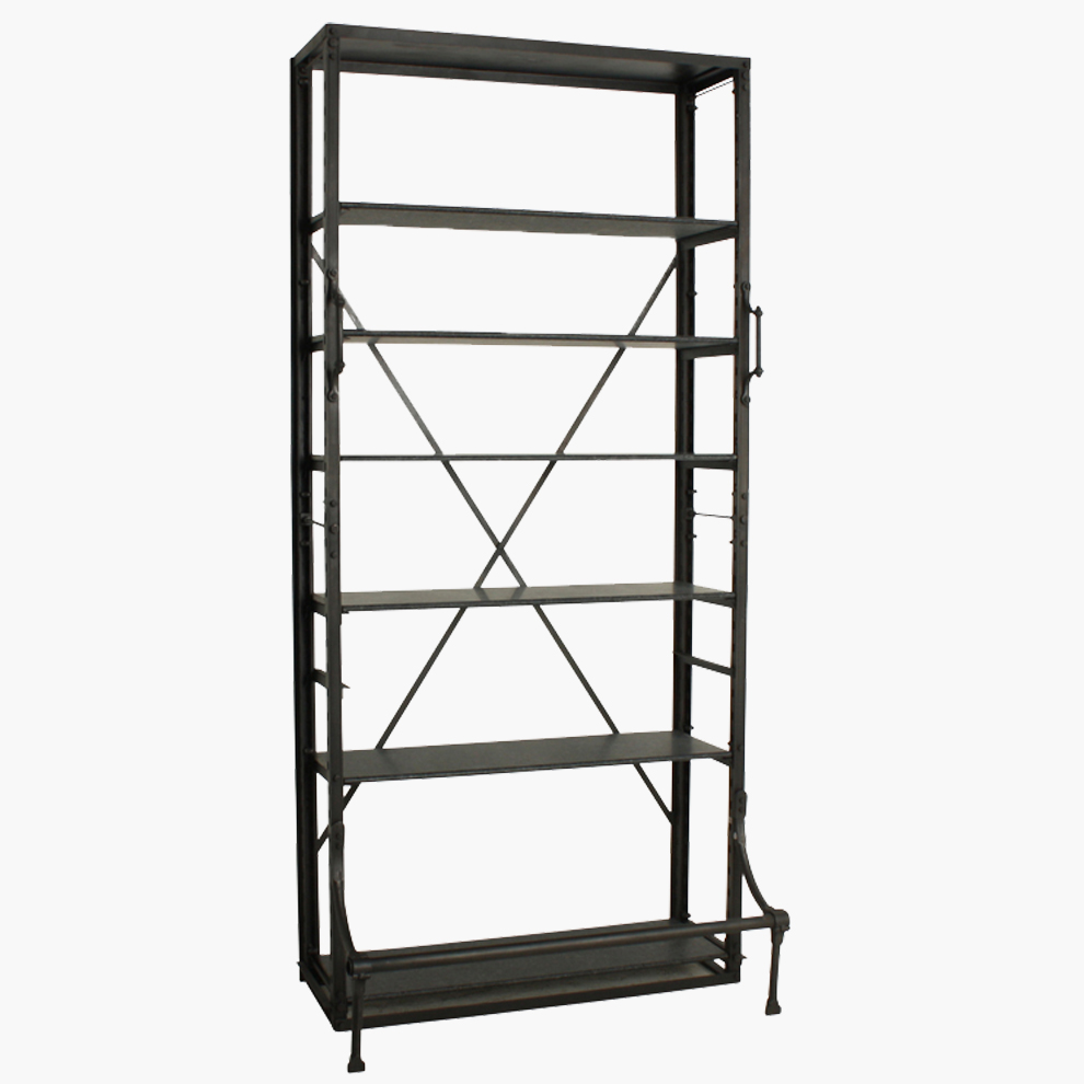 A reproduction of a European library bookcase (mid-1940s). Made of solid metal and perfect to display books and other collectibles. It has two handles on the front and a bar. By standing on the bar you can reach the higher shelves. You can change the position of the shelves at any height you need.