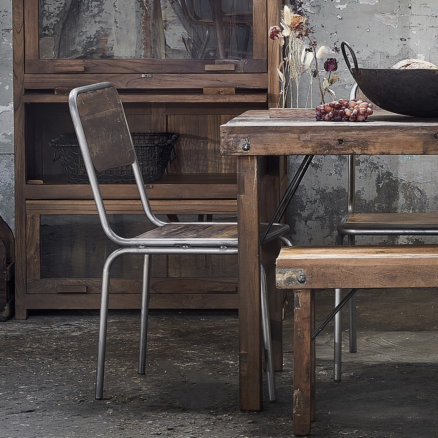 Eetkamerstoel uit onze Factory collectie. Het gerecyclede hout wordt gecombineerd met een ijzeren frame. Deze eetkamerstoel is ideaal te combineren met een van onze (Factory) tafelbladen en onderstellen. Ook te verkrijgen als barkruk!