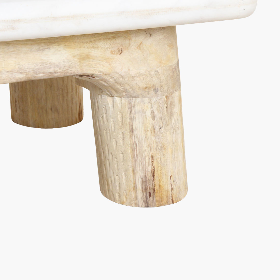 Unieke salontafel met een tafelblad van steen. Het onderstel is volledig gemaakt van hout. De massieve poten en de afgeronde vormen maken van deze tafel een ware eye-catcher!